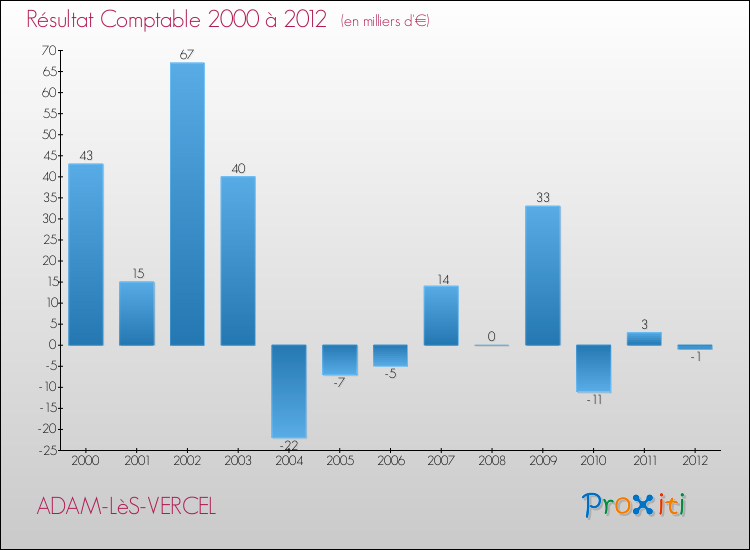 Le résultat comptable de la commune de Adam-lès-Vercel s'établissait ainsi à : -1 000 € fin 2012 (recettes-dépenses).