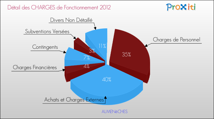 En 2012, les charges de fonctionnement de la commune de Almenêches étaient de : 215 000 € décomposées comme suit :