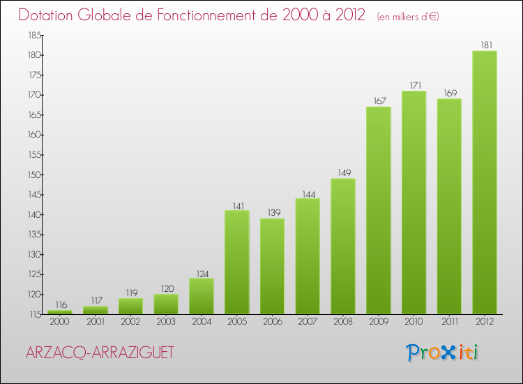 En 2012, le budget de fonctionnement de la commune de Arzacq-Arraziguet se montait à : 960 000 € décomposé comme suit :