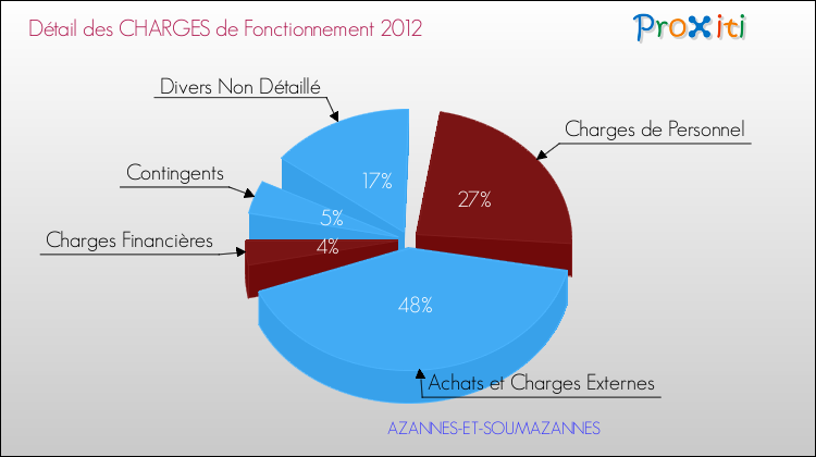 En 2012, les charges de fonctionnement de la commune de Azannes-et-Soumazannes étaient de : 82 000 € décomposées comme suit :