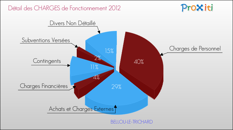 En 2012, les charges de fonctionnement de la commune de Bellou-le-Trichard étaient de : 130 000 € décomposées comme suit :