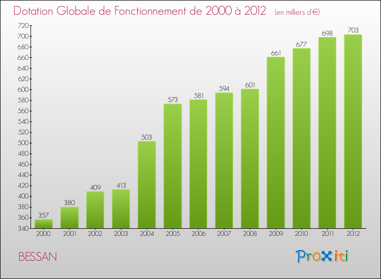 En 2012, le budget de fonctionnement de la commune de Bessan se montait à : 3 985 000 € décomposé comme suit :
