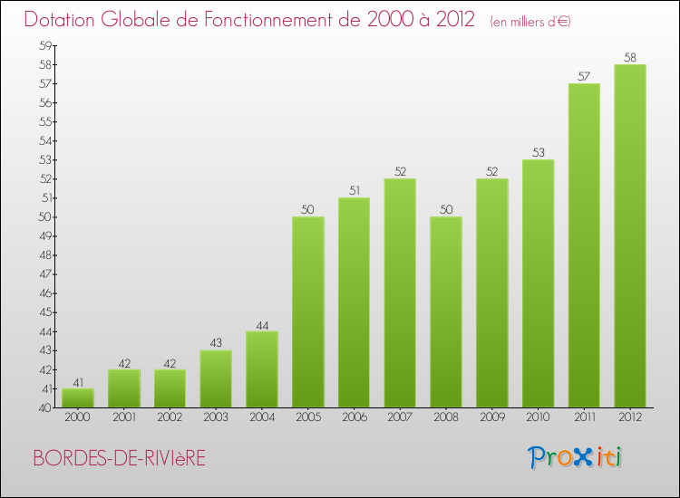 En 2012, le budget de fonctionnement de la commune de Bordes-de-Rivière se montait à : 197 000 € décomposé comme suit :