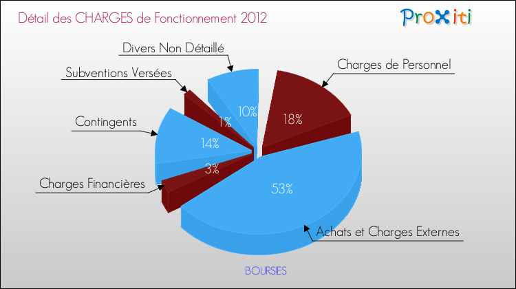 En 2012, les charges de fonctionnement de la commune de Boursies étaient de : 136 000 € décomposées comme suit :