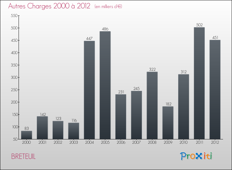 En 2012, les charges de fonctionnement de la commune de Breteuil étaient de : 2 958 000 € décomposées comme suit :
