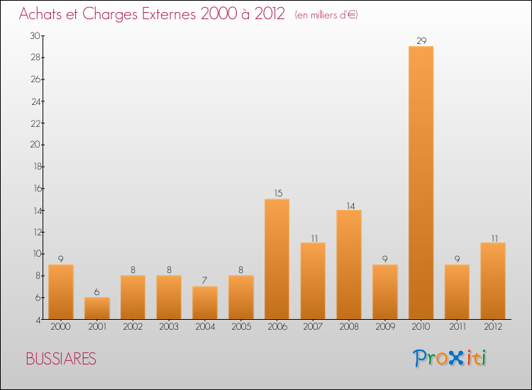 En 2012, les charges de fonctionnement de la commune de Bussiares étaient de : 49 000 € décomposées comme suit :