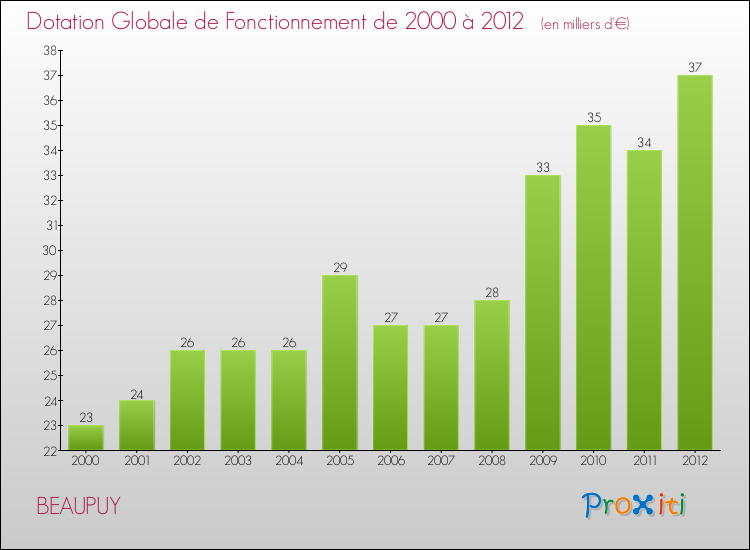 En 2012, le budget de fonctionnement de la commune de Beaupuy se montait à : 125 000 € décomposé comme suit :