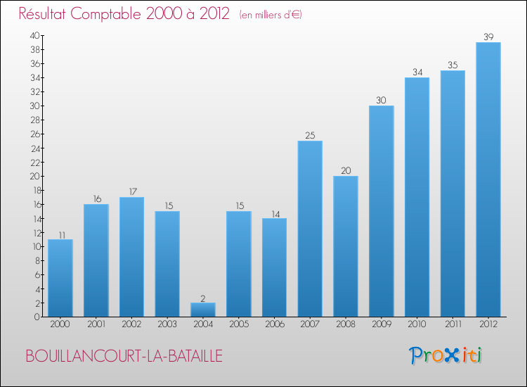 Le résultat comptable de la commune de Bouillancourt-la-Bataille s'établissait ainsi à : + 39 000 € fin 2012.