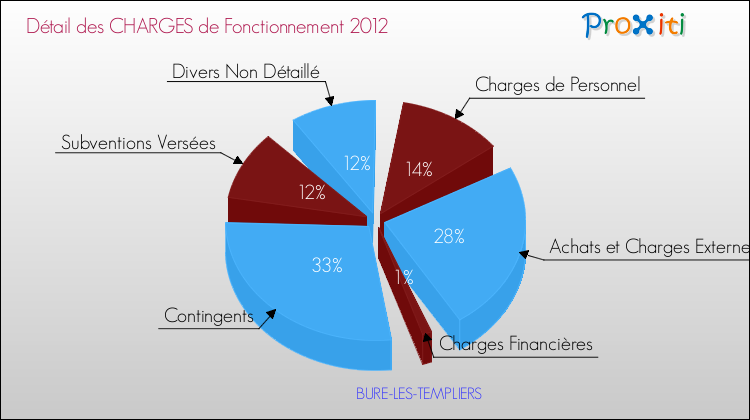 En 2012, les charges de fonctionnement de la commune de Bure-les-Templiers étaient de : 155 000 € décomposées comme suit :