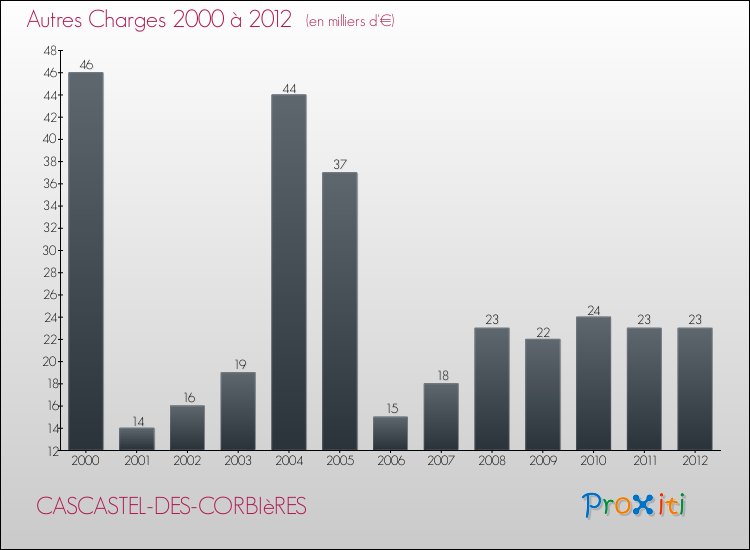 En 2012, les charges de fonctionnement de la commune de Cascastel-des-Corbières étaient de : 209 000 € décomposées comme suit :