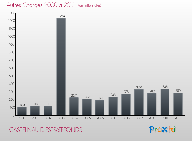 En 2012, les charges de fonctionnement de la commune de Castelnau-d'Estrétefonds étaient de : 4 913 000 € décomposées comme suit :