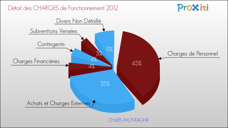 En 2012, les charges de fonctionnement de la commune de Châtel-Montagne étaient de : 285 000 € décomposées comme suit :
