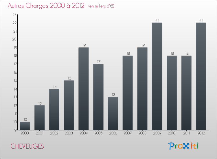 En 2012, les charges de fonctionnement de la commune de Cheveuges étaient de : 225 000 € décomposées comme suit :