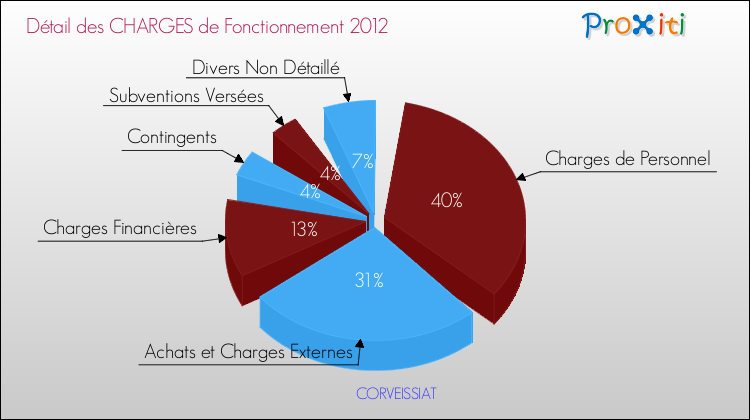 En 2012, les charges de fonctionnement de la commune de Corveissiat étaient de : 465 000 € décomposées comme suit :