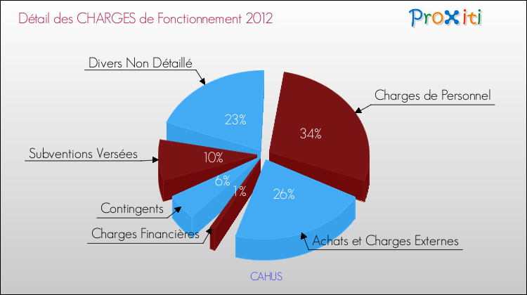 En 2012, les charges de fonctionnement de la commune de Cahus étaient de : 214 000 € décomposées comme suit :