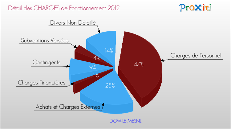 En 2012, les charges de fonctionnement de la commune de Dom-le-Mesnil étaient de : 368 000 € décomposées comme suit :