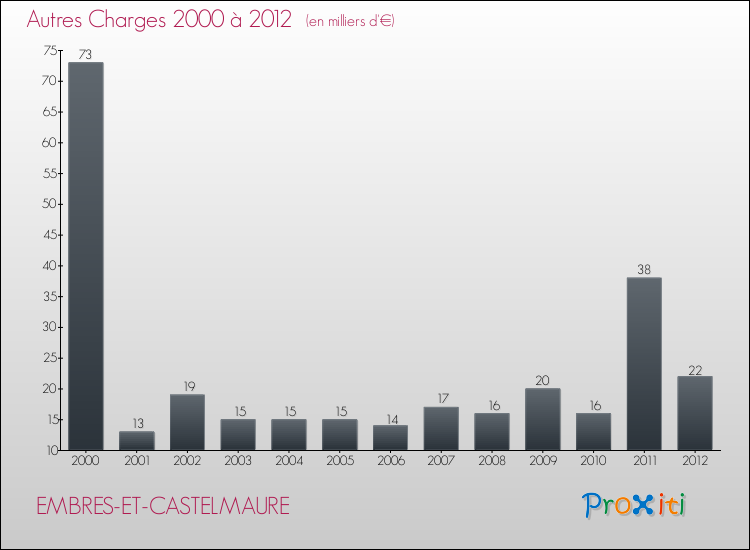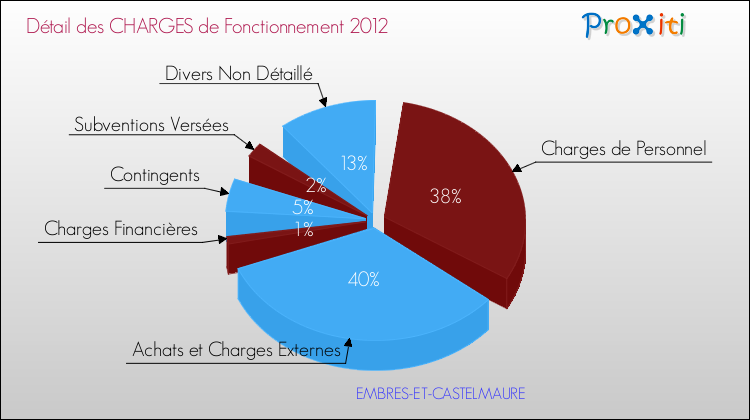 En 2012, les charges de fonctionnement de la commune de Embres-et-Castelmaure étaient de : 165 000 € décomposées comme suit :