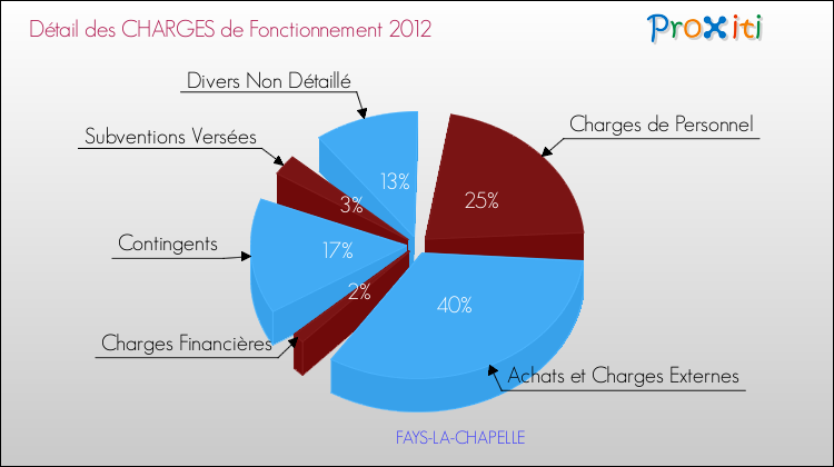 En 2012, les charges de fonctionnement de la commune de Fays-la-Chapelle étaient de : 63 000 € décomposées comme suit :