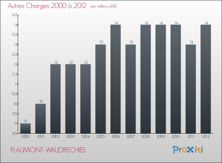 En 2012, les charges de fonctionnement de la commune de Flaumont-Waudrechies étaient de : 148 000 € décomposées comme suit :