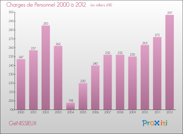 En 2012, les charges de fonctionnement de la commune de Génissieux étaient de : 1 297 000 € décomposées comme suit :