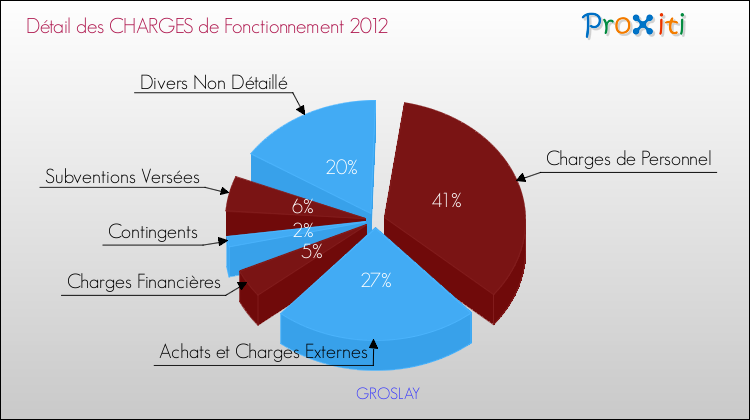 En 2012, les charges de fonctionnement de la commune de Groslay étaient de : 9 456 000 € décomposées comme suit :