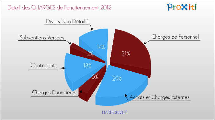 En 2012, les charges de fonctionnement de la commune de Harponville étaient de : 83 000 € décomposées comme suit :