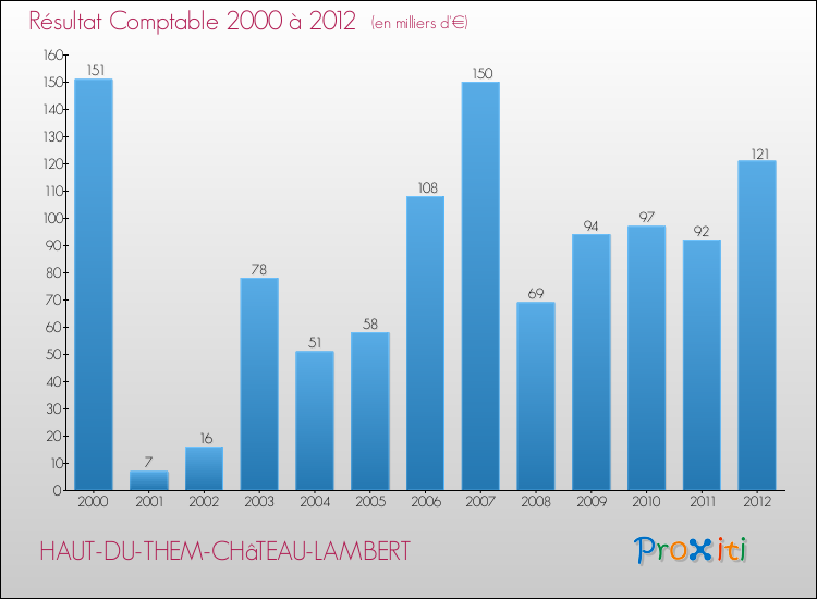 Le résultat comptable de la commune de Haut-du-Them-Château-Lambert s'établissait ainsi à : + 121 000 € fin 2012.