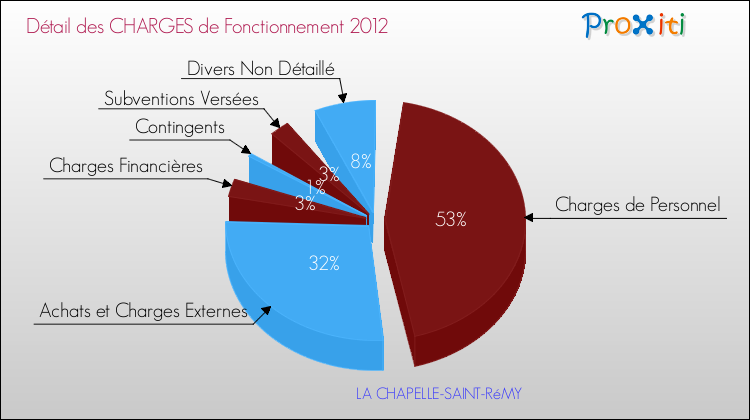 En 2012, les charges de fonctionnement de la commune de La Chapelle-Saint-Rémy étaient de : 374 000 € décomposées comme suit :