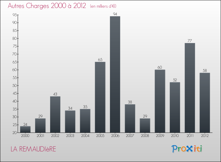 En 2012, les charges de fonctionnement de la commune de La Remaudière étaient de : 543 000 € décomposées comme suit :