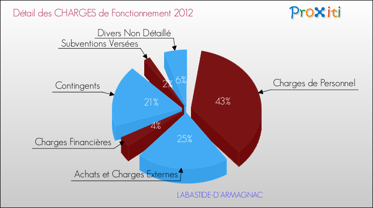En 2012, les charges de fonctionnement de la commune de Labastide-d'Armagnac étaient de : 537 000 € décomposées comme suit :