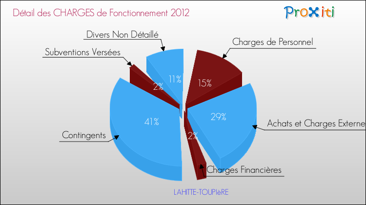 En 2012, les charges de fonctionnement de la commune de Lahitte-Toupière étaient de : 123 000 € décomposées comme suit :