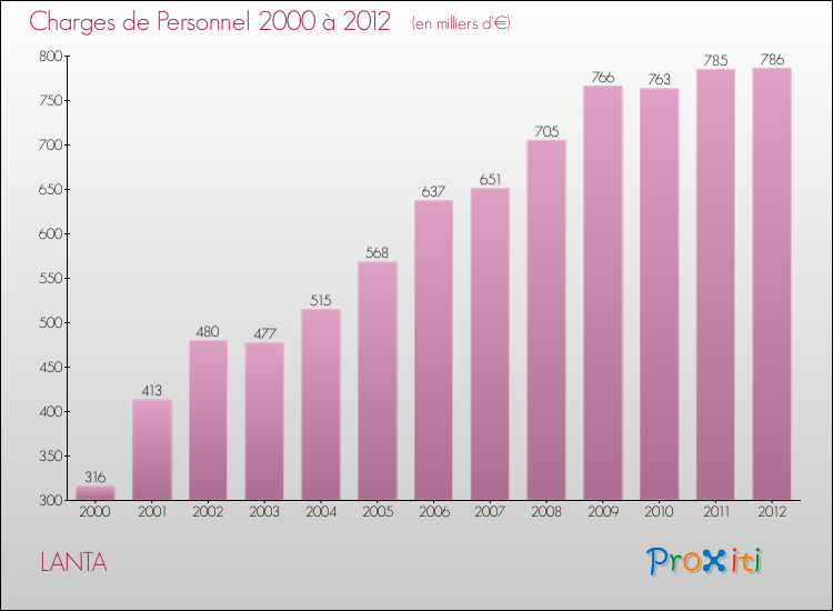 En 2012, le budget de fonctionnement de la commune de Lanta se montait à : 1 964 000 € décomposé comme suit :