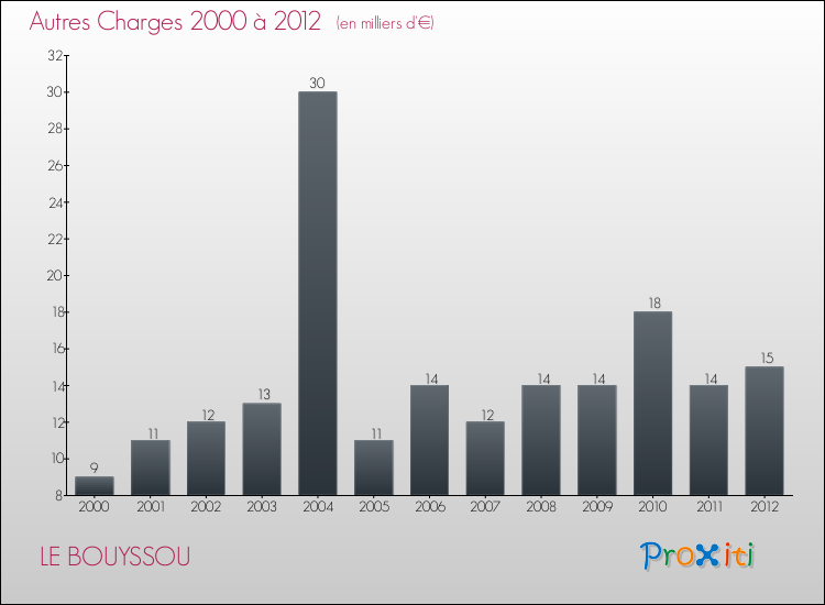 En 2012, les charges de fonctionnement de la commune de Le Bouyssou étaient de : 81 000 € décomposées comme suit :