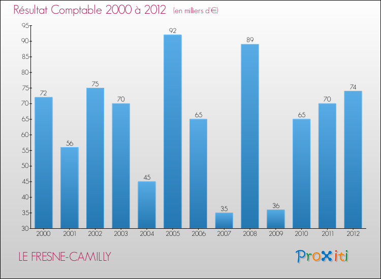 Le résultat comptable de la commune de Le Fresne-Camilly s'établissait ainsi à : + 74 000 € fin 2012.