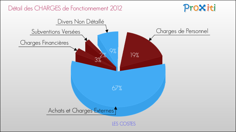 En 2012, les charges de fonctionnement de la commune de Les Costes étaient de : 103 000 € décomposées comme suit :