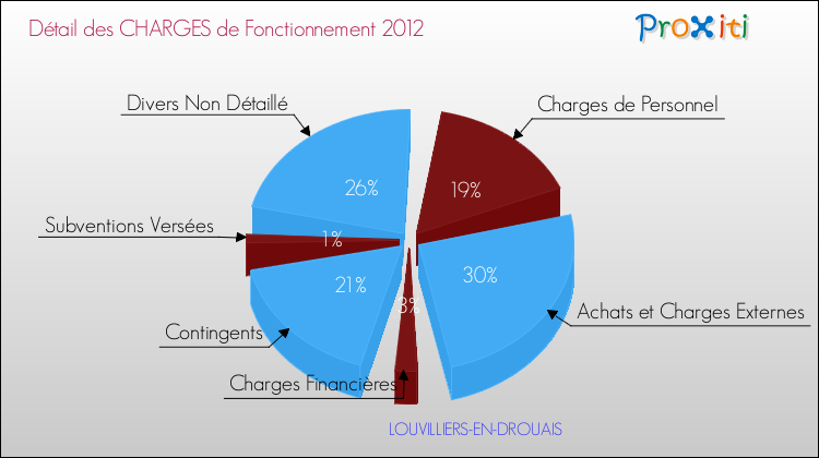 En 2012, les charges de fonctionnement de la commune de Louvilliers-en-Drouais étaient de : 73 000 € décomposées comme suit :