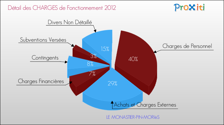 En 2012, les charges de fonctionnement de la commune de Le Monastier-Pin-Moriès étaient de : 491 000 € décomposées comme suit :
