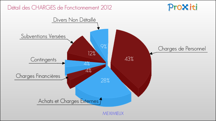 En 2012, le budget de fonctionnement de la commune de Meximieux se montait à : 6 414 000 € décomposé comme suit :