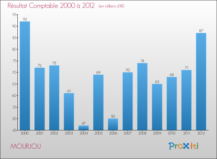 Le résultat comptable de la commune de Mourjou s'établissait ainsi à : + 87 000 € fin 2012.
