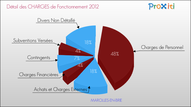 En 2012, les charges de fonctionnement de la commune de Marolles-en-Brie étaient de : 6 246 000 € décomposées comme suit :