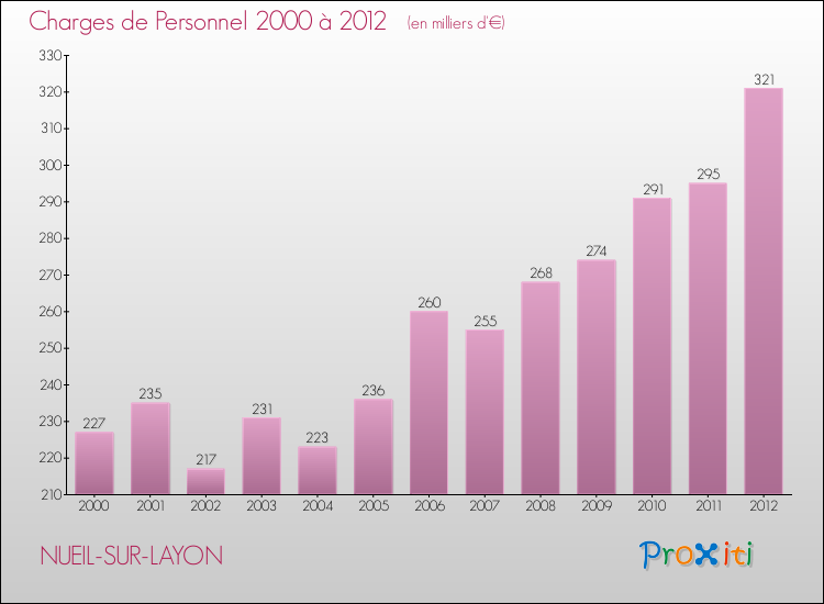 En 2012, les charges de fonctionnement de la commune de Nueil-sur-Layon étaient de : 850 000 € décomposées comme suit :