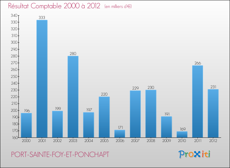 Le résultat comptable de la commune de Port-Sainte-Foy-et-Ponchapt s'établissait ainsi à : + 231 000 € fin 2012.
