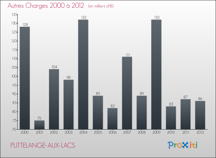 En 2012, les charges de fonctionnement de la commune de Puttelange-aux-Lacs étaient de : 1 456 000 € décomposées comme suit :