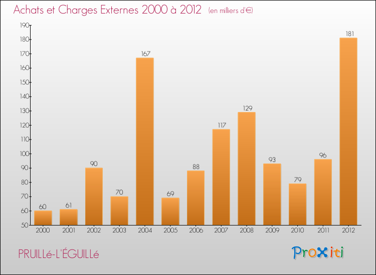 En 2012, les charges de fonctionnement de la commune de Pruillé-l'Éguillé étaient de : 489 000 € décomposées comme suit :