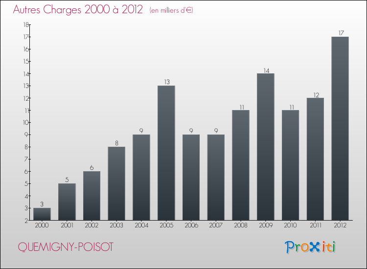 En 2012, les charges de fonctionnement de la commune de Quemigny-Poisot étaient de : 86 000 € décomposées comme suit :