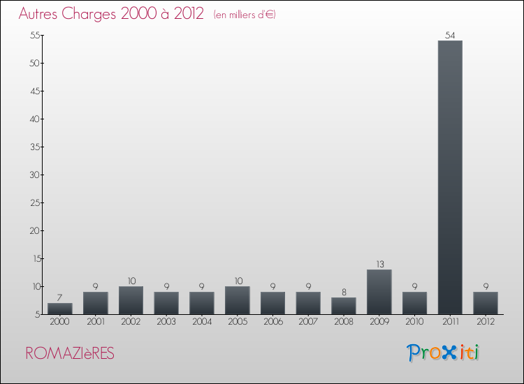 En 2012, les charges de fonctionnement de la commune de Romazières étaient de : 31 000 € décomposées comme suit :