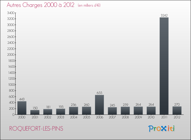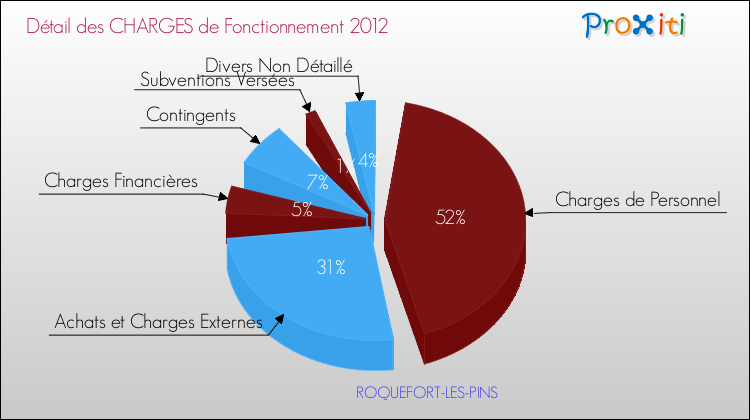 En 2012, les charges de fonctionnement de la commune de Roquefort-les-Pins étaient de : 6 663 000 € décomposées comme suit :