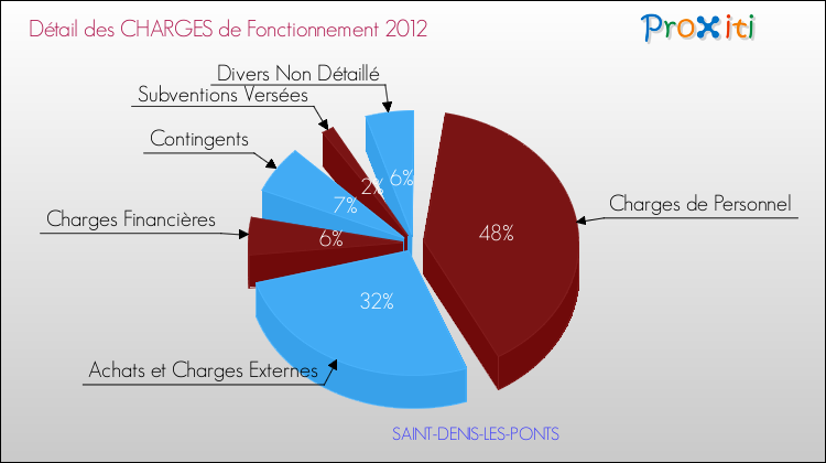 En 2012, les charges de fonctionnement de la commune de Saint-Denis-les-Ponts étaient de : 1 340 000 € décomposées comme suit :
