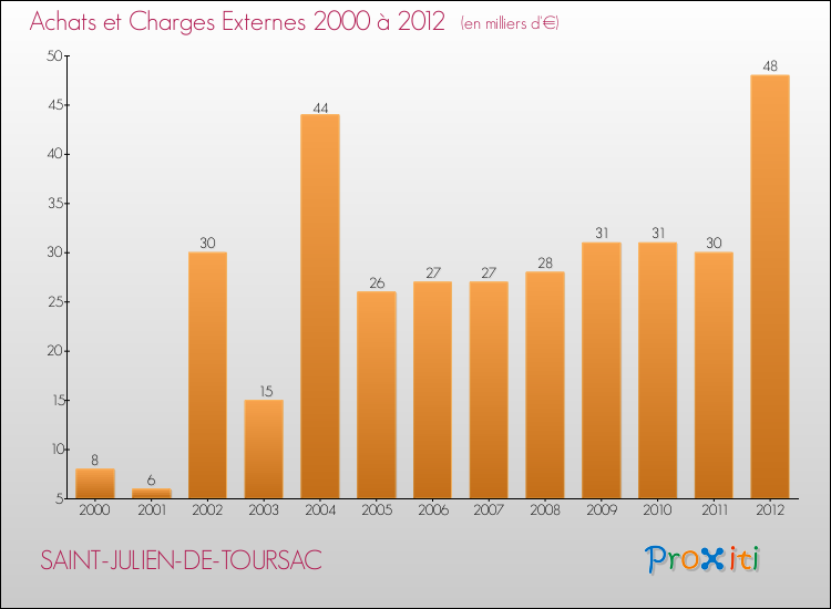 En 2012, les charges de fonctionnement de la commune de Saint-Julien-de-Toursac étaient de : 90 000 € décomposées comme suit :