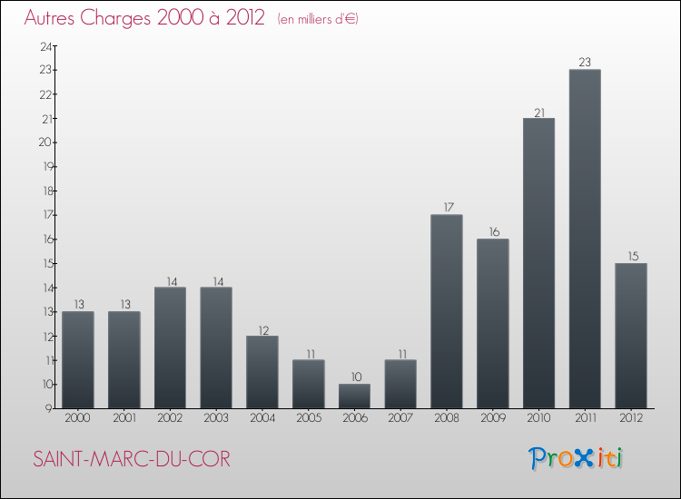 En 2012, les charges de fonctionnement de la commune de Saint-Marc-du-Cor étaient de : 110 000 € décomposées comme suit :